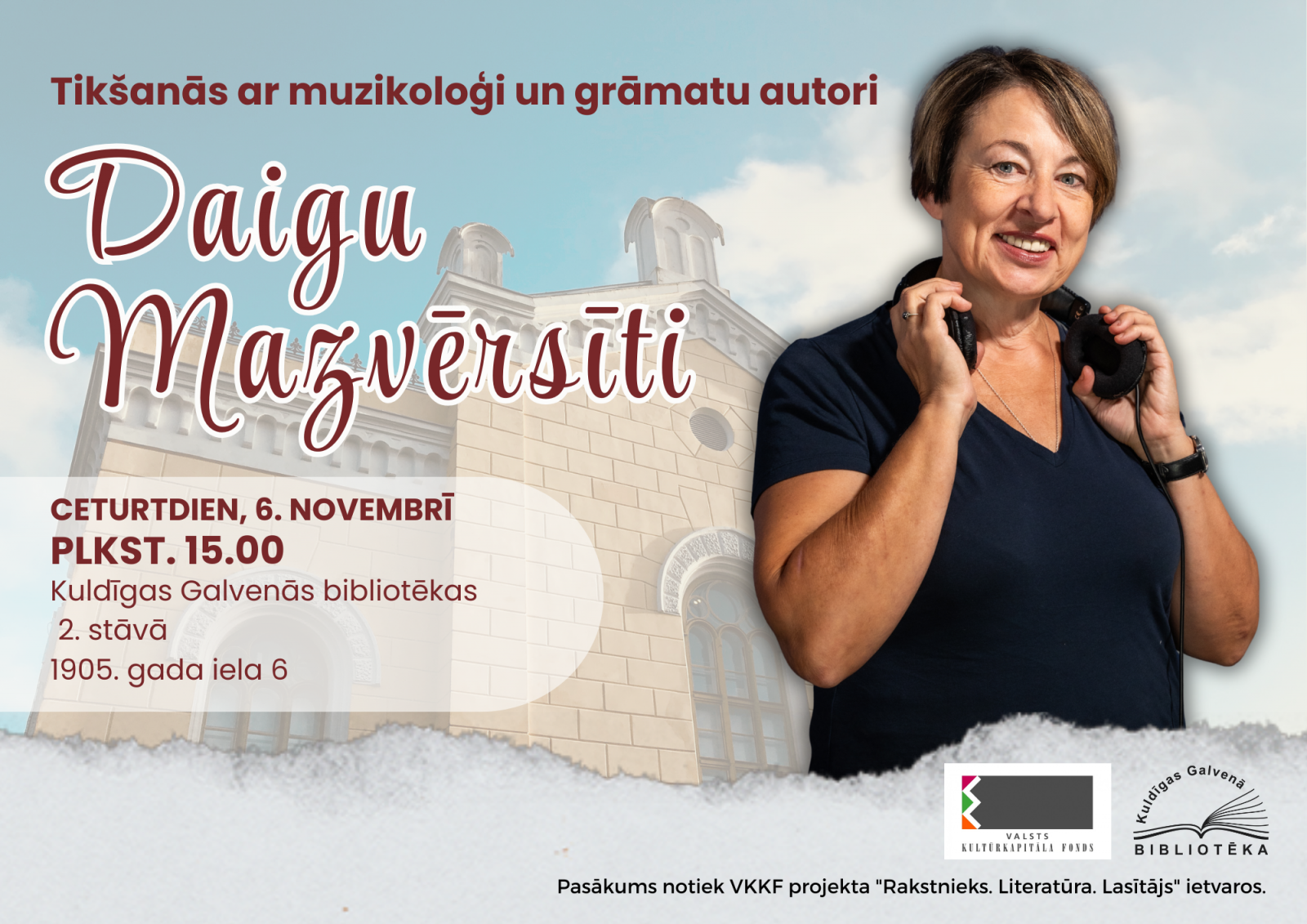 6. novembrī plkst. 15.00 Kuldīgas Galvenās bibliotēkas 2. stāvā notiks tikšanās ar muzikoloģi, Latvijas radio 2 mūzikas programmas vadītāju un grāmatu autori Daigu Mazvērsīti.
