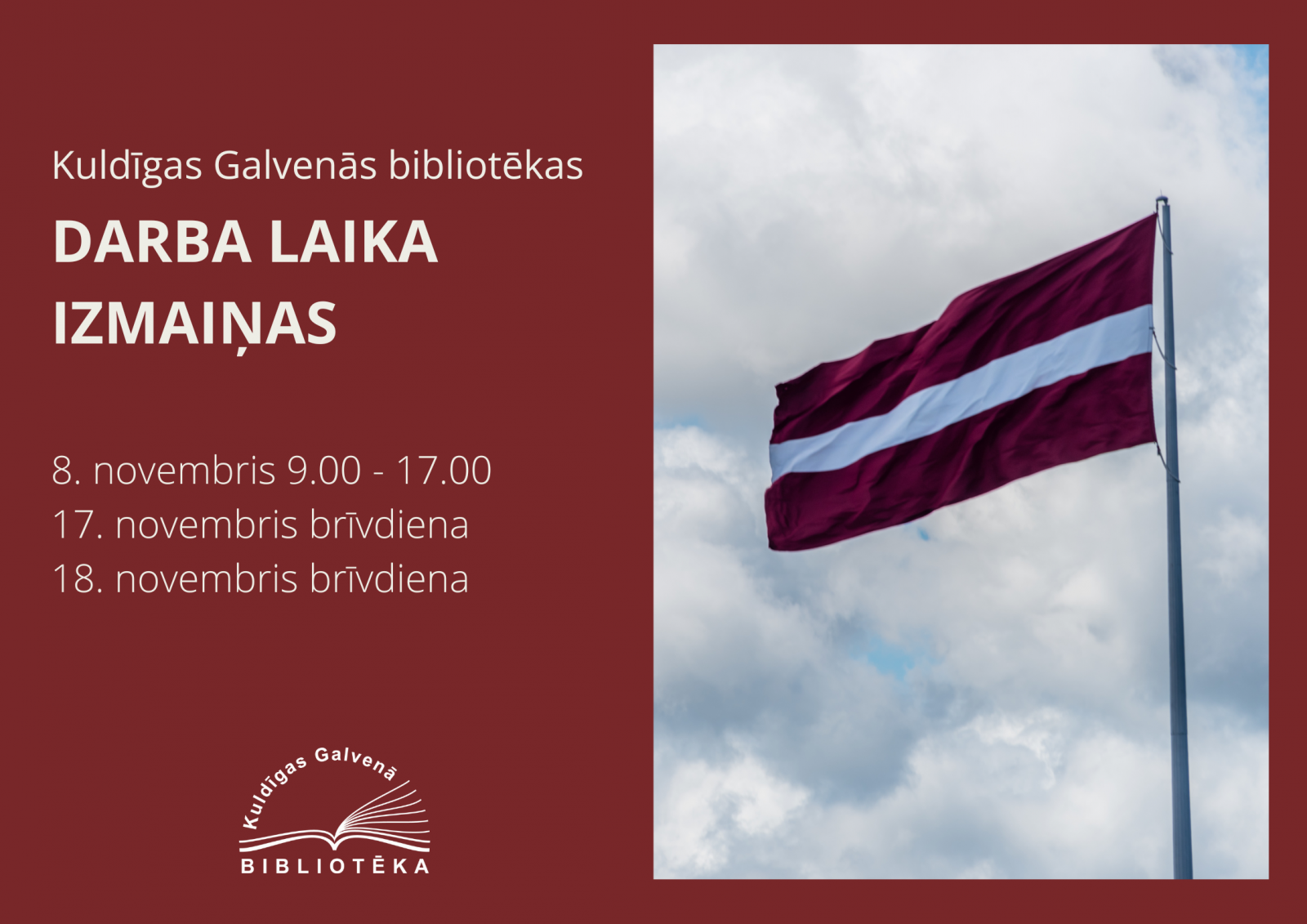 Darba laika izmaiņas svētkos 2025. g. 06. novembrī ieteikt tvītot Dalies FOTO / VIDEO / PDF / POWERPOINT Kuldīgas Galvenās bibliotēkas darba laiks svētku laikā ● 8. novembris – 9.00 –17.00 ● 17. novembris – brīvdiena ● 18. novembris – brīvdiena (svētku diena)