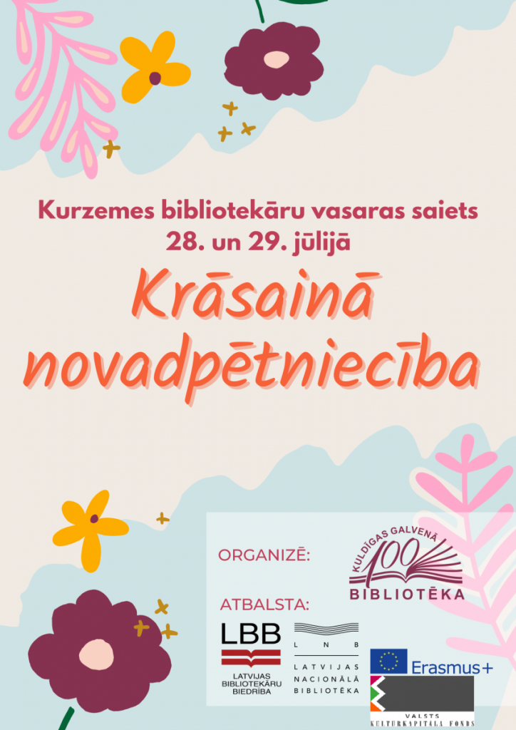 2021. gada 28. jūlijā klātienē un 29. jūlijā tiešsaistē notiks Latvijas Bibliotekāru biedrības un Kuldīgas Galvenās bibliotēkas organizētais Kurzemes bibliotekāru vasaras saiets “Krāsainā novadpētniecība”. Saieta norisi atbalsta Latvijas Bibliotekāru biedrība, Latvijas Nacionālā bibliotēka, Valsts kultūrkapitāla fonds, Erasmus+ un Kuldīgas novada pašvaldība.