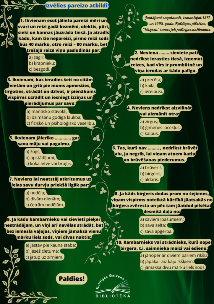 Piedāvājam pārbaudīt savas zināšanas par dzīvi un ikdienu 16.-18. gadsimtā. Cik labi tu spēsi atbildēt uz jautājumiem, kas sagatavoti, izmantojot Kuldīgas pilsētas “birģeru runas” jeb policijas nolikumu?
