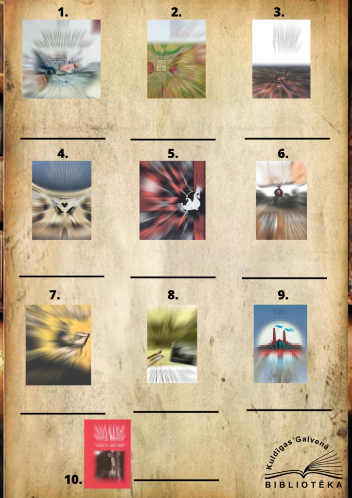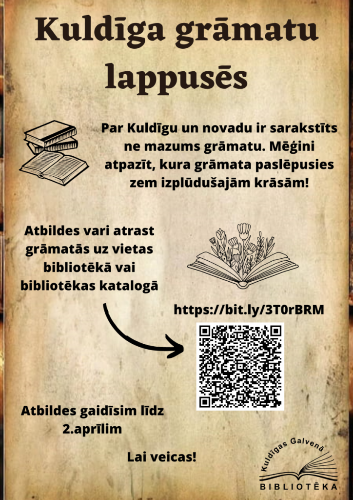 Lai piedalītos konkursā, atbildes (grāmatu nosaukumus) līdz 2. aprīlim iesniedz https://bit.ly/3YBZlWQ vai uz vietas bibliotēkā.