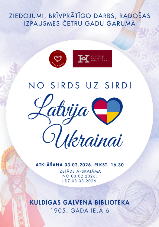 3. februārī plkst. 16.30 Kuldīgas Galvenās bibliotēkas 2. stāvā notiks mākslas darbu izstādes “No sirds uz sirdi – Latvija Ukrainai” atklāšana.