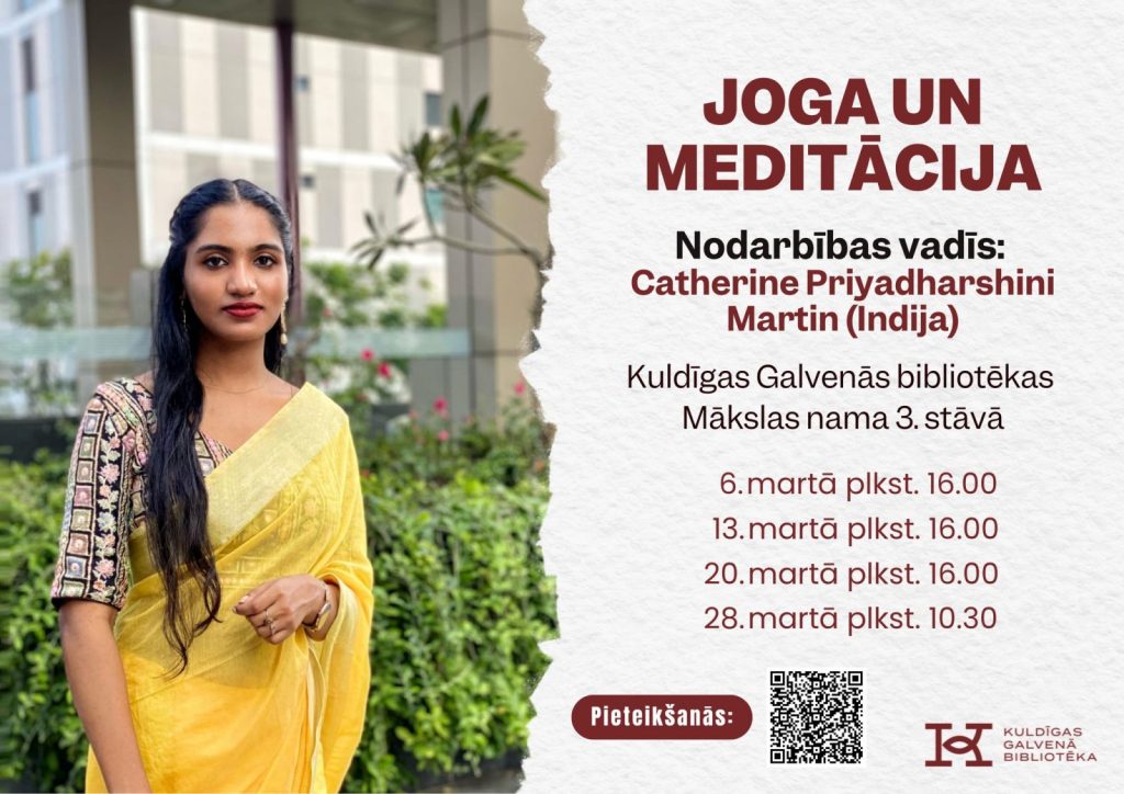 6. martā plkst. 16.00 Kuldīgas Galvenās bibliotēkas Mākslas nama 3. stāvā notiks pirmā jogas un meditācijas bezmaksas nodarbība, kuru vadīs Catherine Priyadharshini Martin.